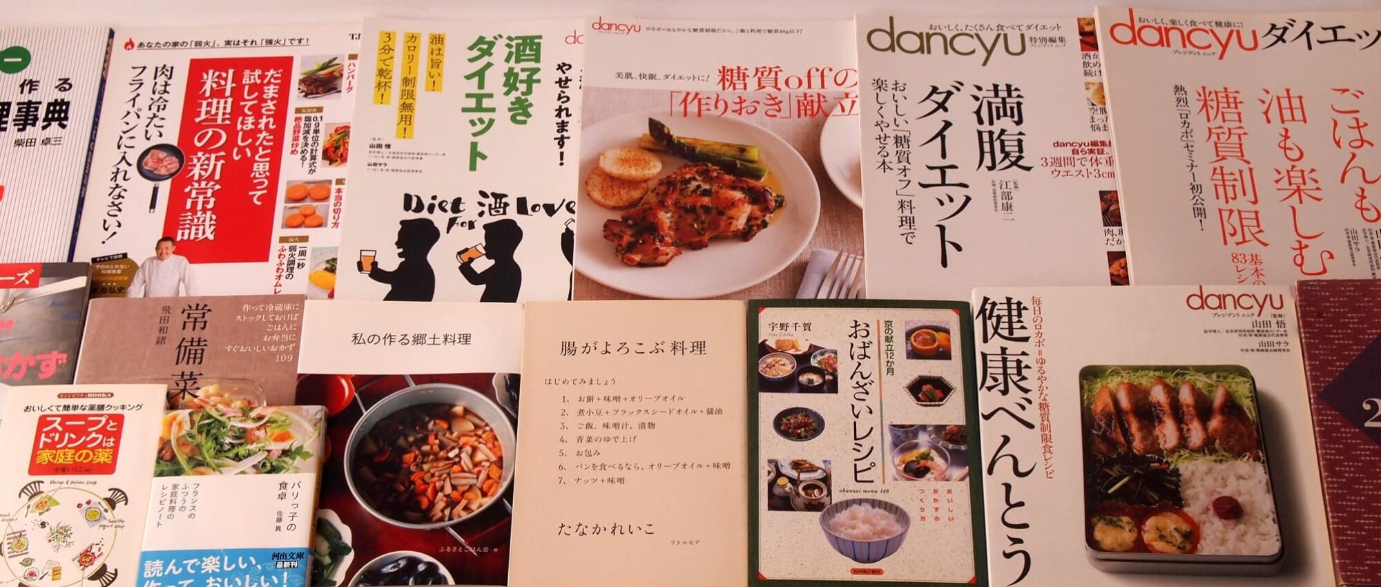 山田悟さん*山田サラさん*監修による『糖質offの「作りおき」献立』『健康べんとう』『dancyuダイエット ごはんも油も楽しむ糖質制限』『酒好きダイエット』、江部康二さん*大柳珠美さん*監修による『満腹ダイエット おいしい「糖質オフ」料理で楽しくやせる本』、浜田ひろみさんによる『おかず 2001 日本人の食卓』、『熊谷喜八の“キハチ流”気ままな洋風おかず』、佐藤真さんによる『パリっ子の食卓 フランスのふつうの家庭料理のレシピノート』、柴田卓三さんによる『洋食メニュー おいしく作るプロの調理事典』、宇野千賀さんによる『おばんざいレシピ 京の献立12か月 おいしいおかずのつくり方』、飛田和緒さんによる『常備菜 作って冷蔵庫にストックしておけばごはんにお弁当にすぐおいしいおかず109』、たなかれいこさんによる『腸がよろこぶ料理』、小泉いくこさんによる『スープとドリンクは家庭の薬 おいしくて簡単な薬膳クッキング』、『私の作る郷土料理』、水島弘史さんによる『料理の新常識 だまされたと思って試してほしい』 etc… 12冊追加、3冊再入荷いたしました!